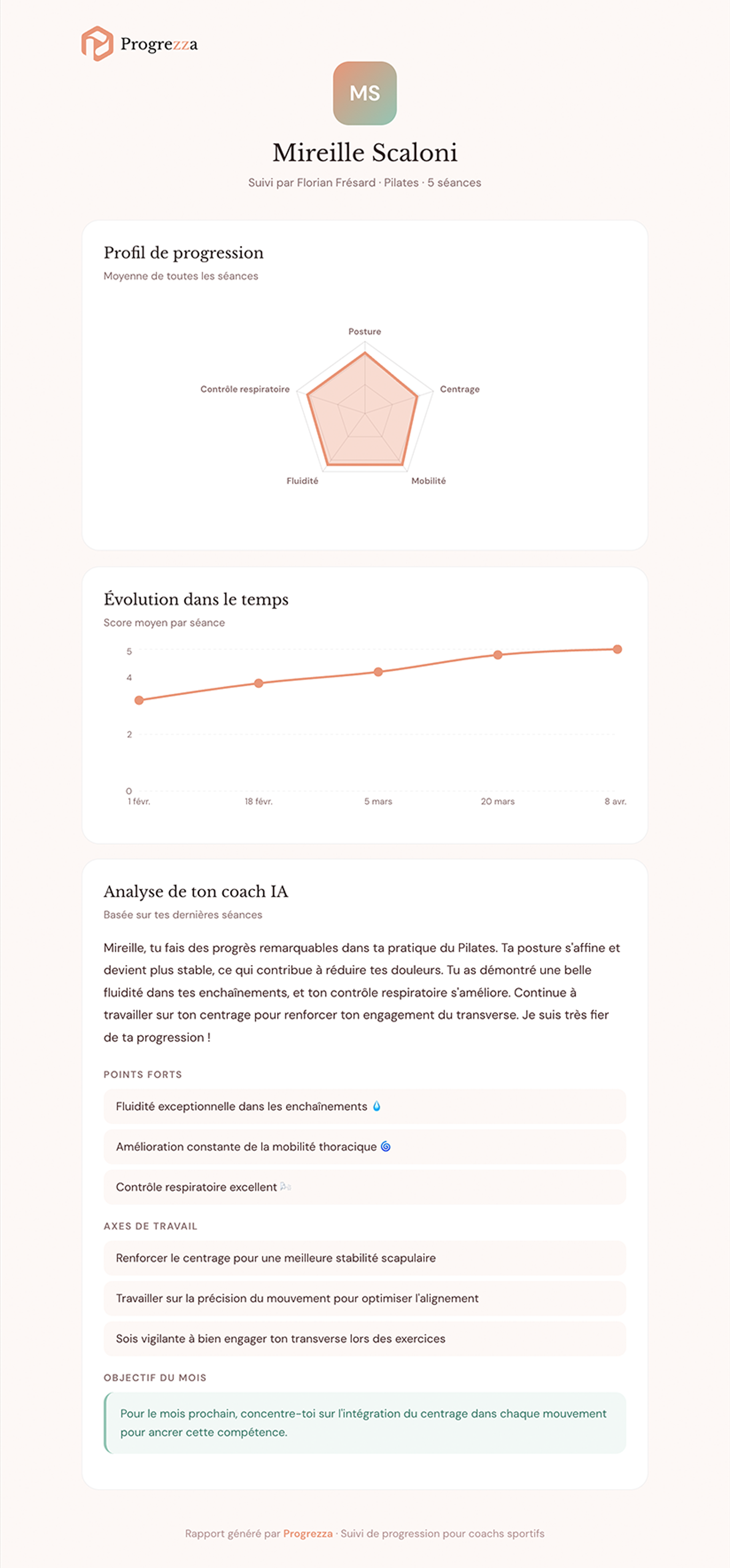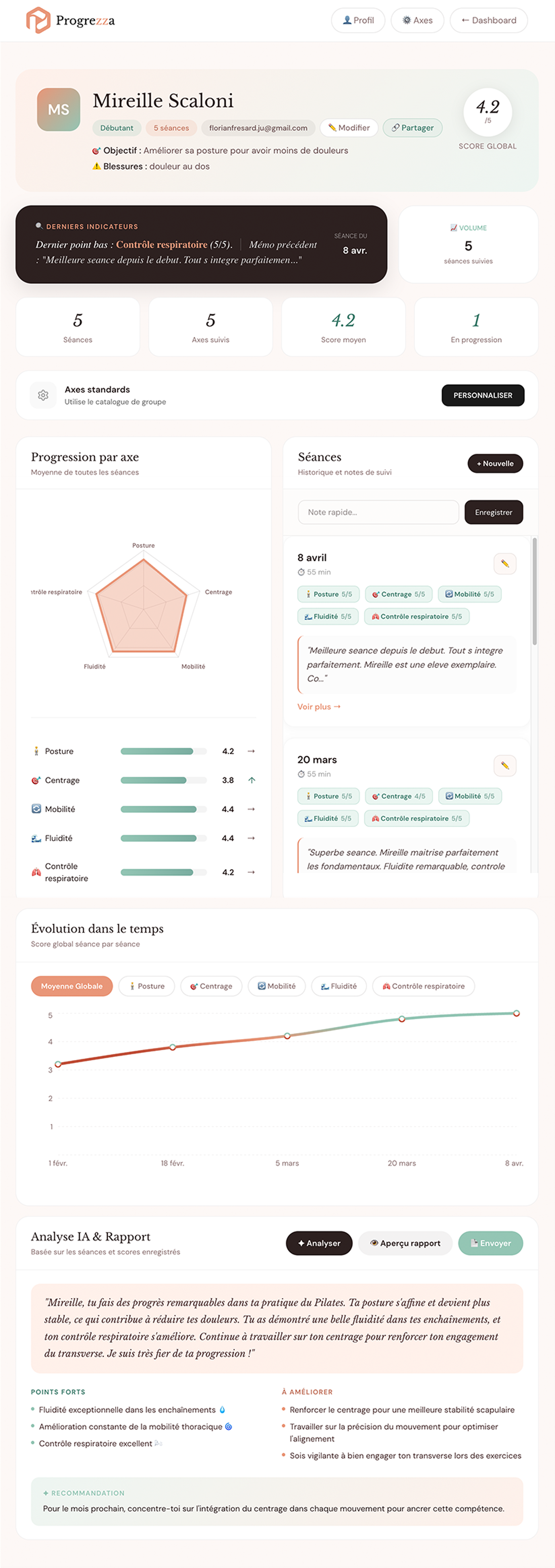 Graphique radar, évolution dans le temps, analyse IA, historique des séances. Tout est là pour générer le rapport en 1 clic.
