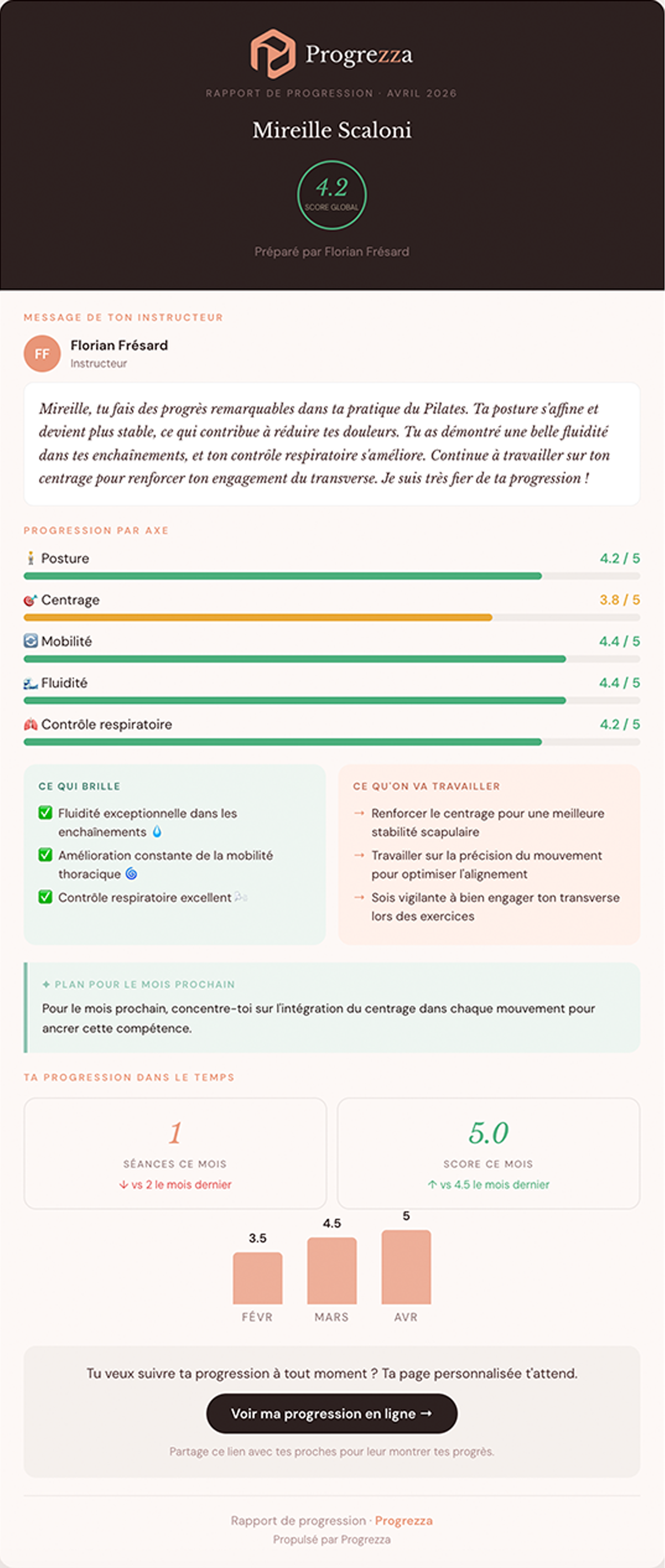 Progrezza rend visible chaque micro-progrès — posture, mobilité, alignement — et envoie un bilan personnalisé à tes élèves chaque mois. En ton nom. En 30 secondes.