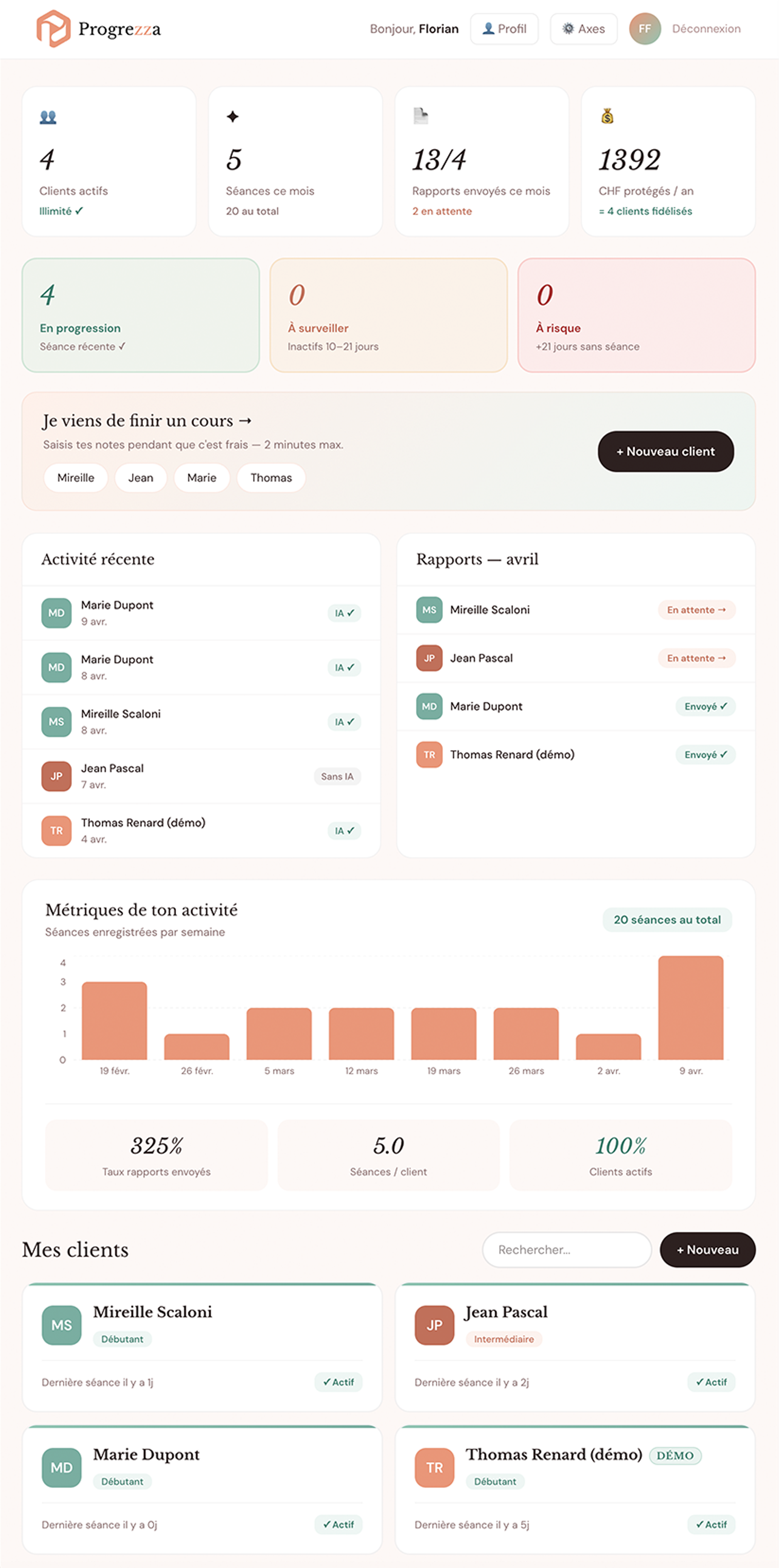 Le dashboard centralise tout — séances récentes, rapports à envoyer, alertes inactivité. Tu sais en 3 secondes qui a besoin de toi ce mois-ci.