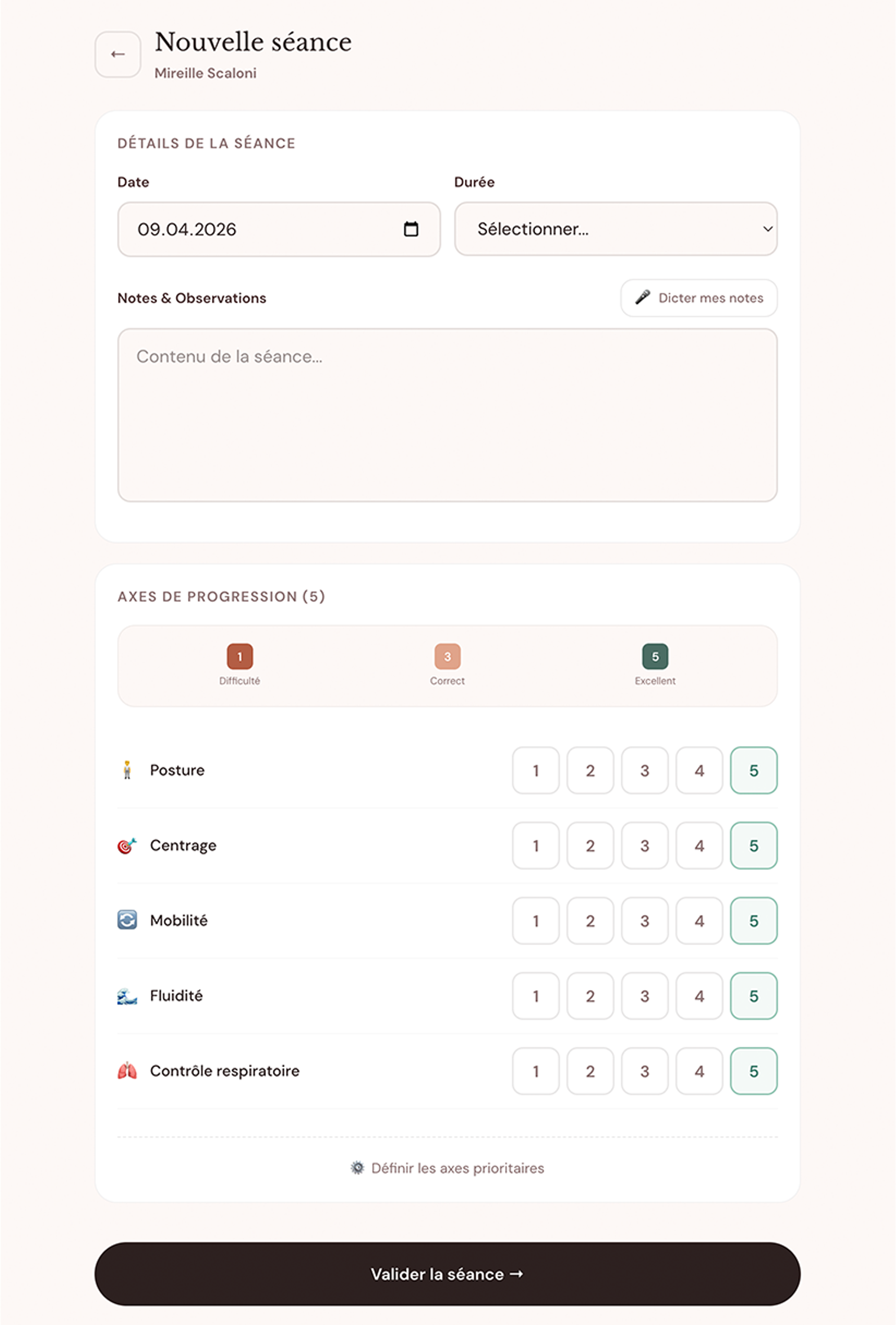 Après chaque séance, tu notes ou dictes tes observations et scores par axe. 30 secondes depuis ton téléphone.